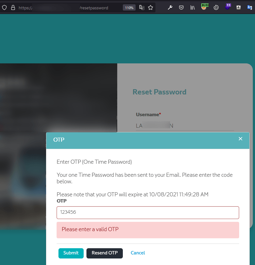 The same flow applied to the password reset feature. The user asked for a password reset, they provided the username and, after that, they had to type in a valid OTP.