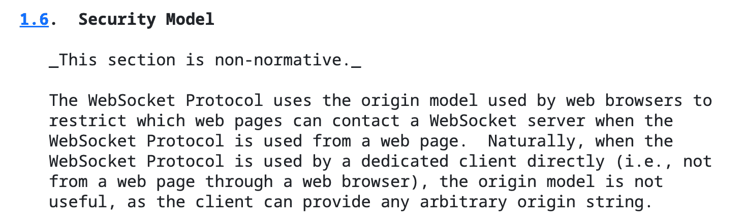 While reading the RFC and digging for a hint that can lead to that kind of vulnerability, I found those two security-related RFC entries - “Security Model” and “WebSocket Client Authentication.”