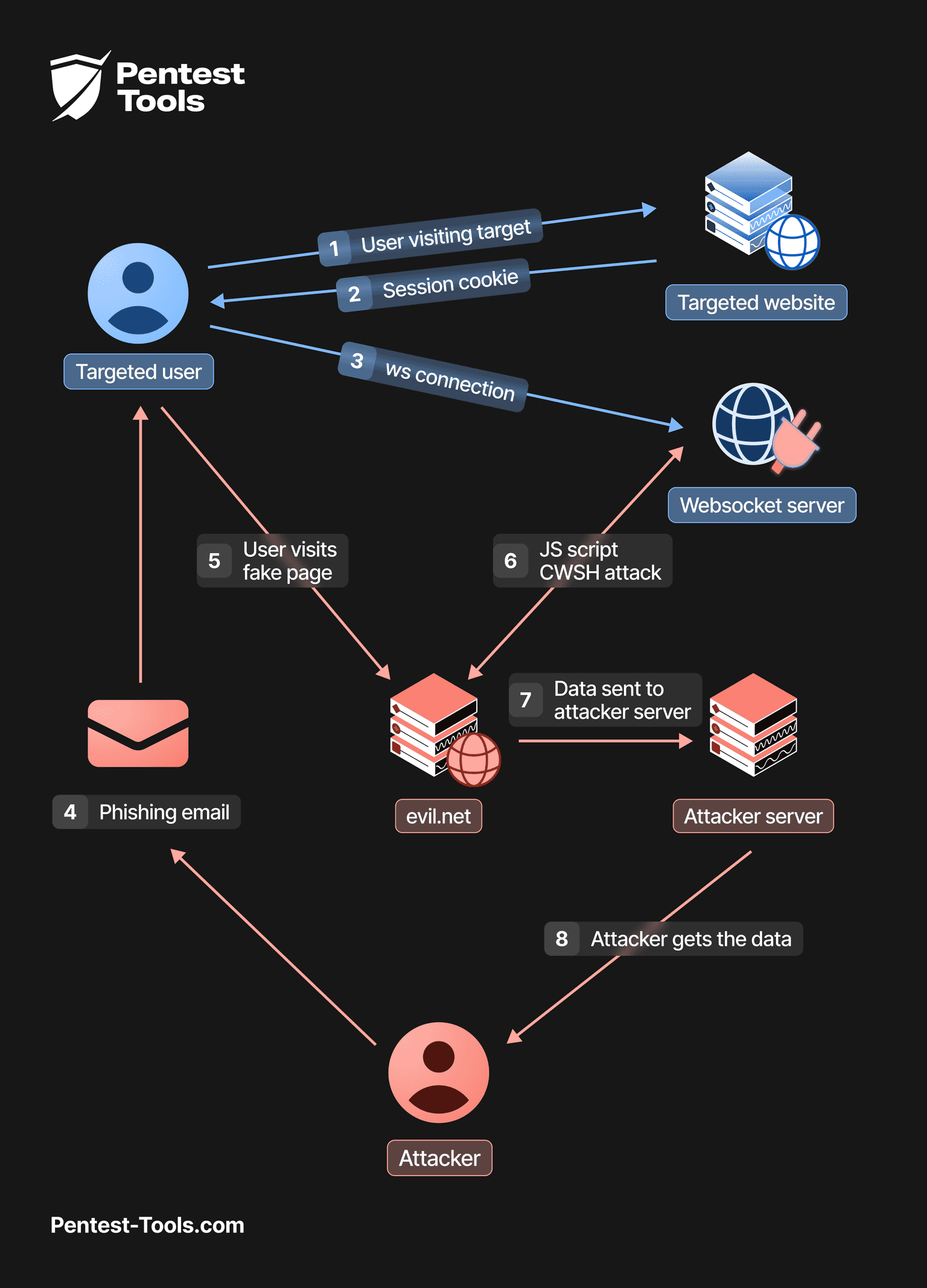 The exploit for this attack will be a Javascript payload crafted to open a WebSocket to the vulnerable application using the victim’s user session cookie.
