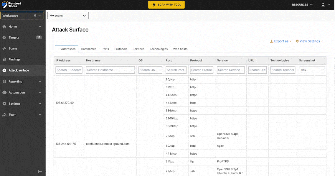 Each workspace you create in your Pentest-Tools.com account generates an Attack Surface specific to the targets in it. Find scan results grouped by asset categories – in a table format you can easily export as CSV or JSON.