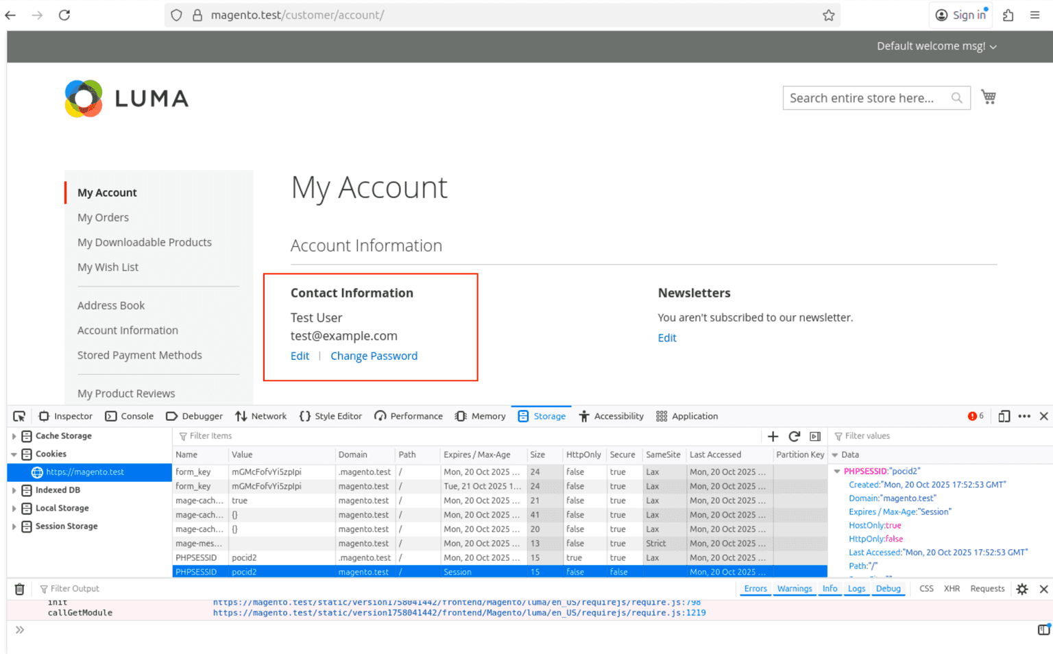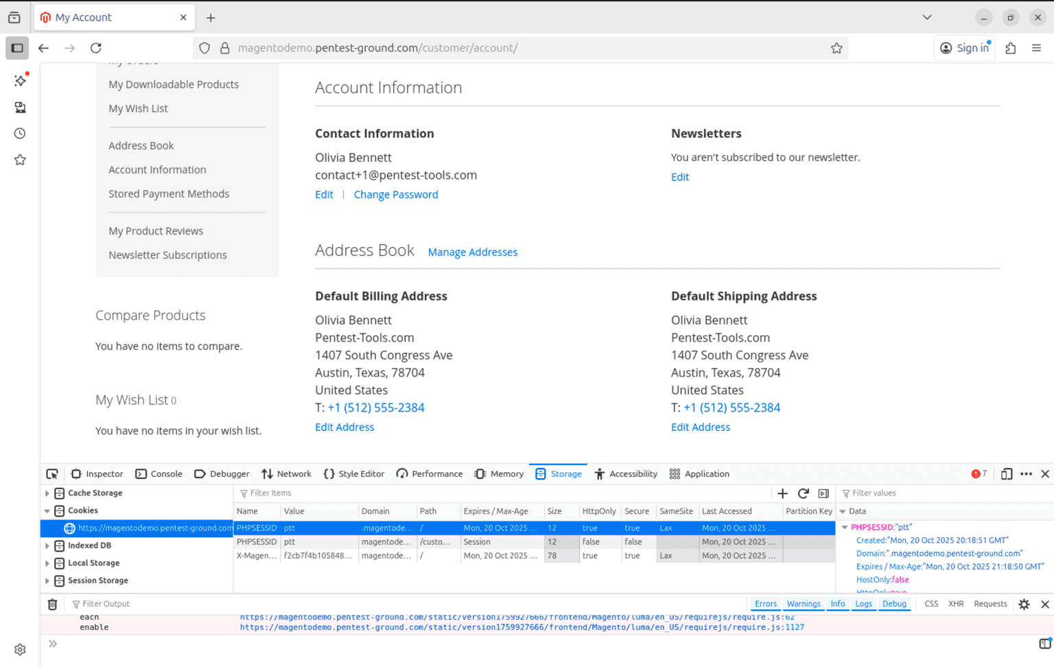 Set-Cookie: PHPSESSID=54d45744ffbf0fc560a2fc511ca96680; expires=Mon, 20 Oct 2025 21:10:34 GMT; Max-Age=3600; path=/; domain=magentodemo.pentest-ground.com; secure; HttpOnly; SameSite=Lax