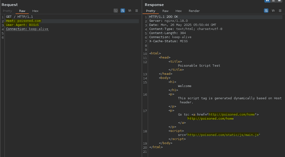 As you can see, the returned response is the one with the script source URL [...] poisoned.com even with the legit Host header's value localhost.